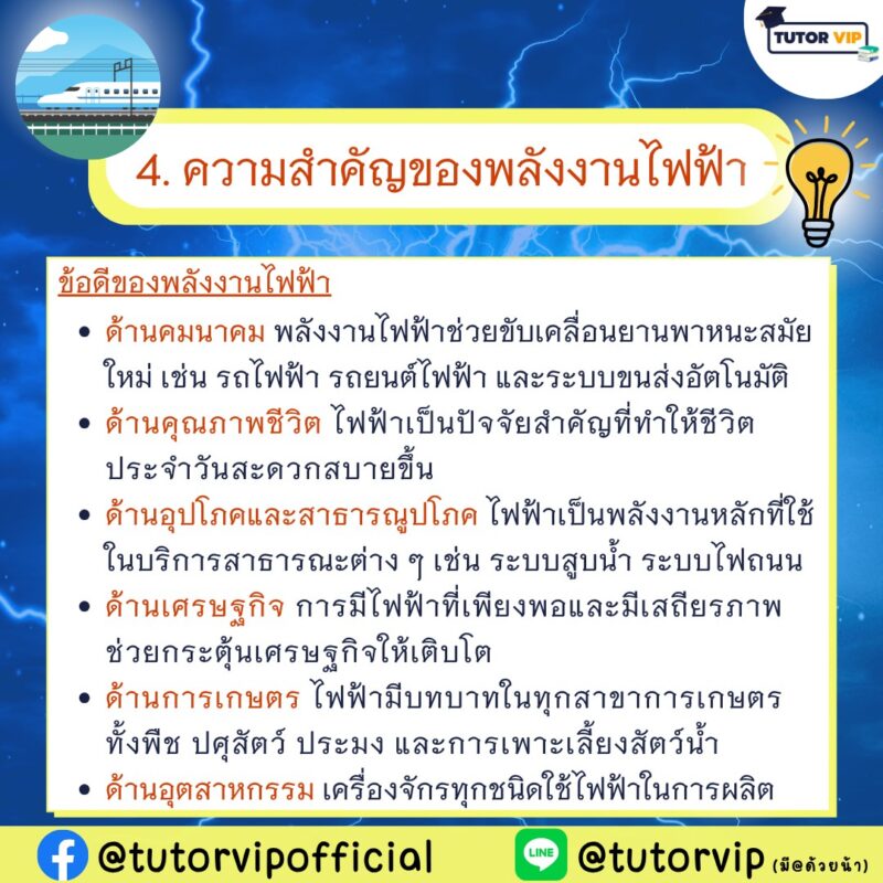 - ด้านคมนาคม พลังงานไฟฟ้าช่วยขับเคลื่อนยานพาหนะสมัยใหม่ เช่น รถไฟฟ้า รถยนต์ไฟฟ้า และระบบขนส่งอัตโนมัติ ทำให้การเดินทางและการขนส่งมีความสะดวก รวดเร็ว และปลอดภัยยิ่งขึ้น