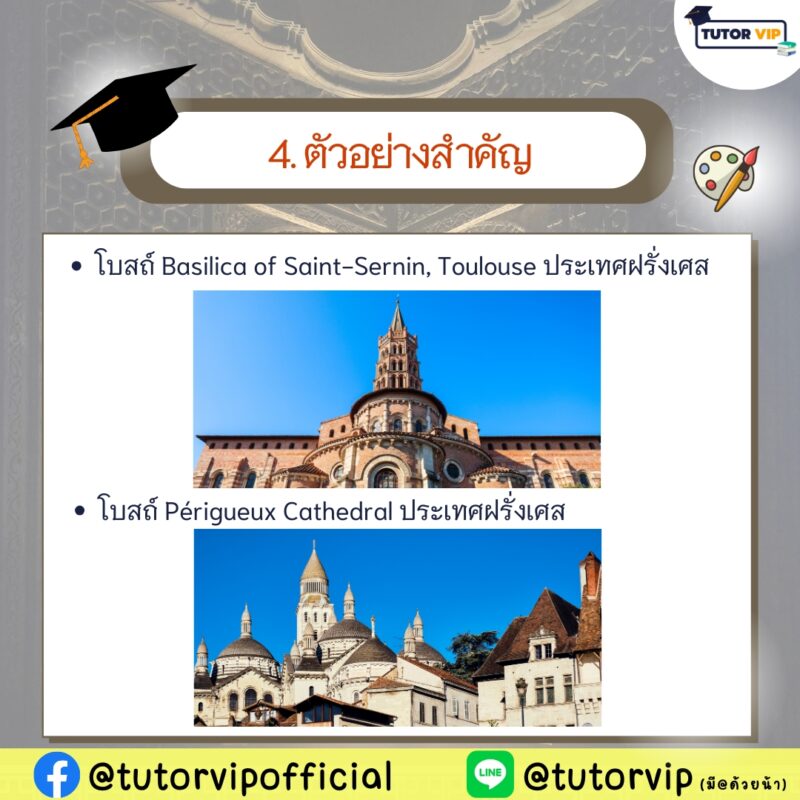 - โบสถ์ Périgueux Cathedral ประเทศฝรั่งเศส มีลักษณะโดมซ้อนกันที่ยังเห็นอิทธิพลจากศิลปะไบแซนไทน์และโรมัน